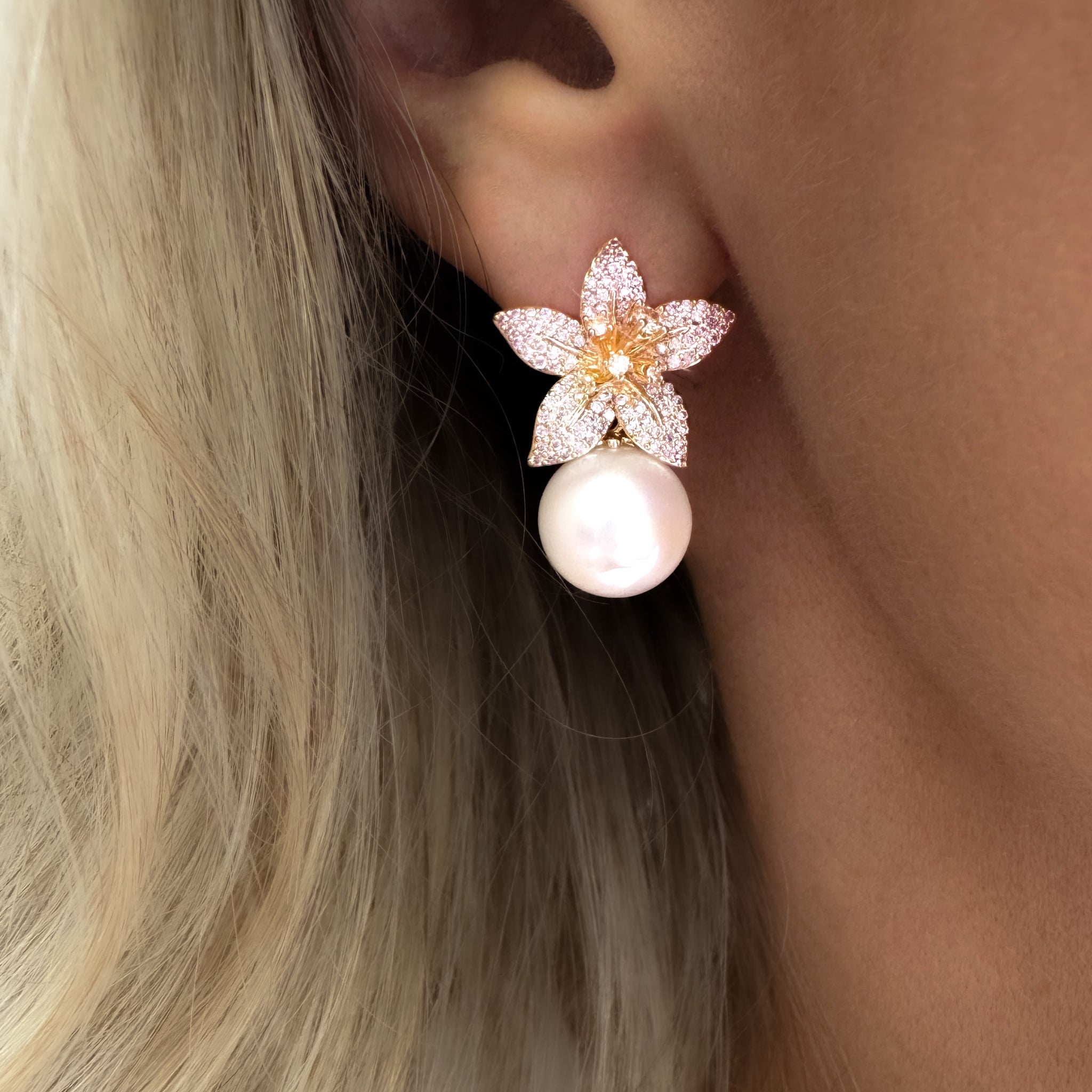 Elegant gold earrings featuring a delicate lily flower base accented with sparkling pavé in a very light baby pink shade and a luminous pearl dangle, perfect for adding a touch of timeless sophistication.